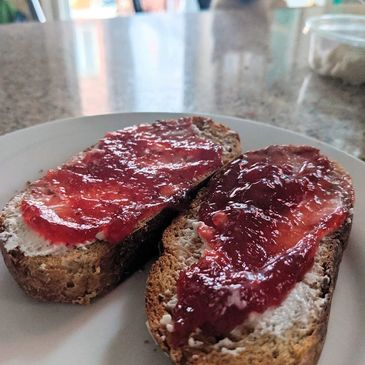 Toasted Raising the Bar LLC bread with Camelot Valley chevre and Oak View Acres strawberry jam smathered on thick and sweet (both products procured through Radish & Rye Food Hub).